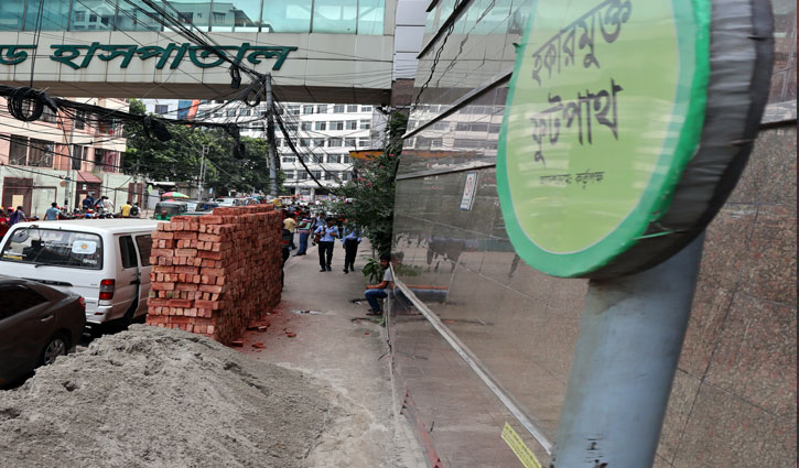 রাজধানীর ল্যাবএইড হাসপাতালের পাশে হকারমুক্ত ফুটপাত সাইনবোর্ড থাকলেও হাঁটার মতো জায়গা নেই। ছবি : শাহীন ভুঁইয়া