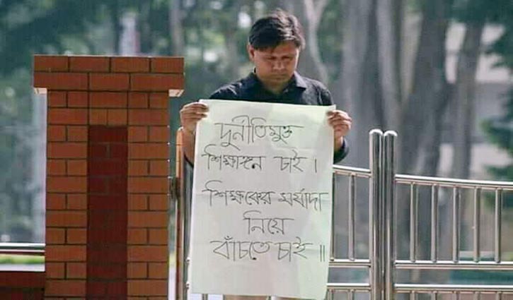 এসময় ‘দুর্নীতিমুক্ত শিক্ষাঙ্গন চাই, শিক্ষকের মর্যাদা নিয়ে বাঁচতে চাই’ লেখা সম্বলিত একটি প্ল্যাকার্ড তাঁর হাতে ছিল।