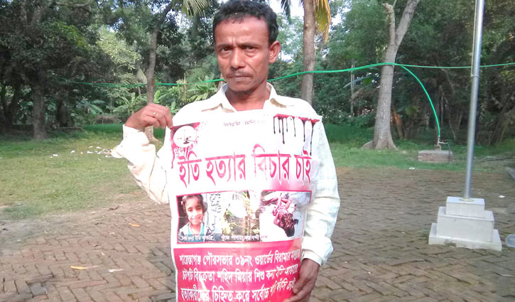 হবিগঞ্জ সংবাদদাতাবিচারের দাবিতে এক বাবা মৃত মেয়ের ছবি বুকে নিয়ে পাড়ায় পাড়ায় ঘুরছেন। প্রায় ১৫ মাস আগে তার মেয়ে ইতি আক্তারকে (৬) হত্যা করে দুর্বৃত্তরা। সেই থেকে হবিগঞ্জ জেলার শায়েস্তাগঞ্জ পৌরসভার পশ্চিম বিরামচরের বাবা আব্দুস শহীদ বিচারের আশায় ঘুরে বেড়াচ্ছেন।