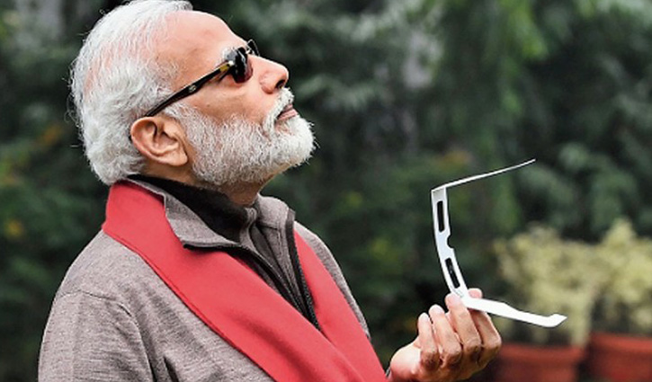 দ্বিতীয় দফায় সরকারে আসার ১০০ দিন পূর্ণ করার দিনটিতে চন্দ্রযানের চন্দ্রাবতরণ দেখতে হাজির হয়েছিলেন ইসরো-র দফতরে। মিশন সফল হয়নি। কিন্তু ইসরো-র চেয়ারপার্সন শিবনকে সান্ত্বনা দিয়ে বুকে টেনে মোদিই ছিলেন খবরের শীর্ষে। সূর্যগ্রহণেও তা-ই থাকলেন, তবে মোদিকে ছাপিয়ে নজর কেড়ে নিল তার চশমা। মোদি নিজে ছবিটি পোস্ট করার পরেই তাতে আলোচনা-সমালোচনার ঝড় ওঠে।