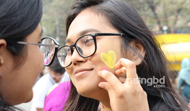 ঢাকা বিশ্ববিদ্যালয়ের শিক্ষার্থী সুমা ও দিপ্তী টিএসসি হয়ে শহীদ মিনারে যাচ্ছিলেন। পথে এক শিল্পি তাদের মুখে আলপনা এঁকে দিতে চাইলেন। দুজনেই মুখে শহীদ মিনারের আলপনা এঁকেছেন।