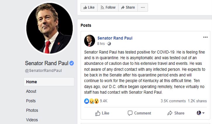 যুক্তরাষ্ট্রের স্থানীয় সময় রোববার (২২ মার্চ) দুপুর ২টার দিকে ওই ফেসবুক পোস্টে জানানো হয়, কোভিড-১৯ শনাক্তকরণ পরীক্ষায় মার্কিন সিনেটর রেন্ড পলের শরীরে এর উপস্থিতি পাওয়া গেছে। তিনি এখন ভালো আছেন এবং কোয়ারেন্টাইনে আছেন।