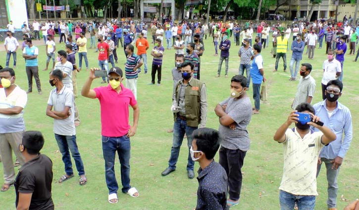 শুক্রবার (২৪ এপ্রিল) দুপুরে নড়াইলের সুলতান মঞ্চ চত্বরে সামাজিক দূরত্ব বজায় রেখে কর্মচারীদের মাঝে চাল, ডাল, তেল, আলু ও সাবান বিতরণ করা হয়।